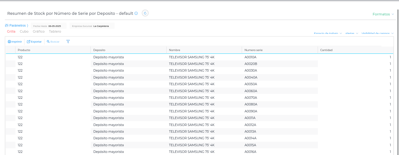 Este informe muestra en qué depósitos se encuentran los productos con un determinado número de serie.