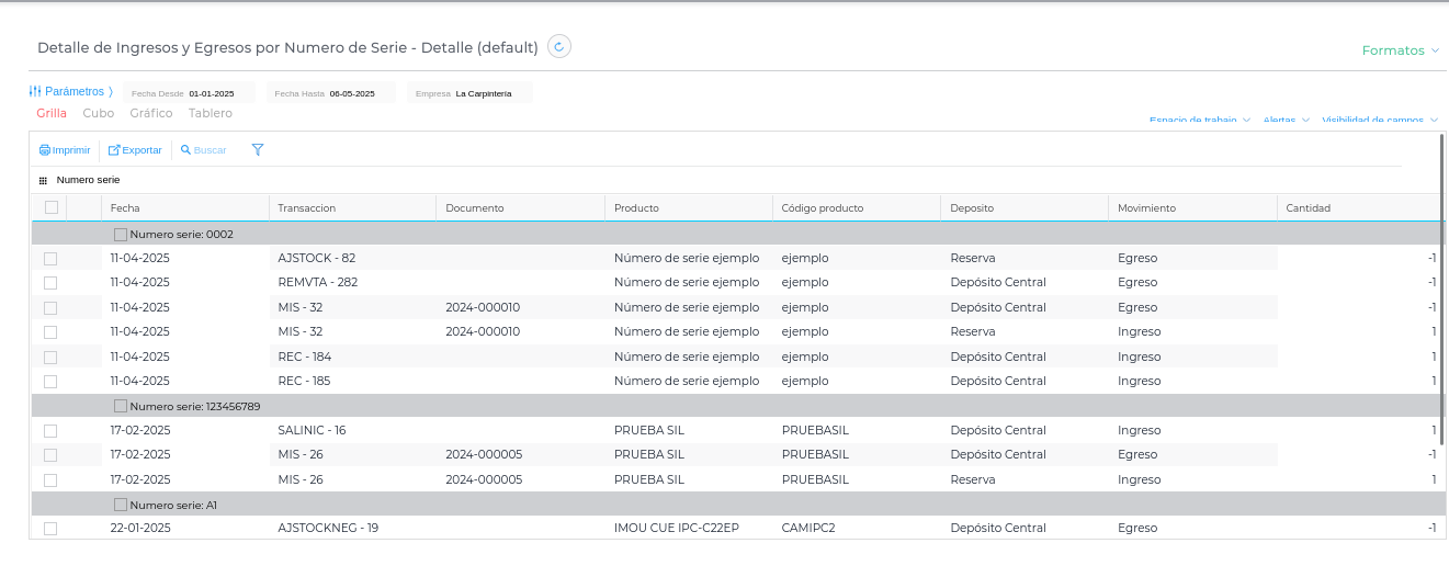 - Número de serie: si se ingresa un valor en este campo, sólo se muestran en la grilla los movimientos de entrada y salida de ese número de serie en particular.