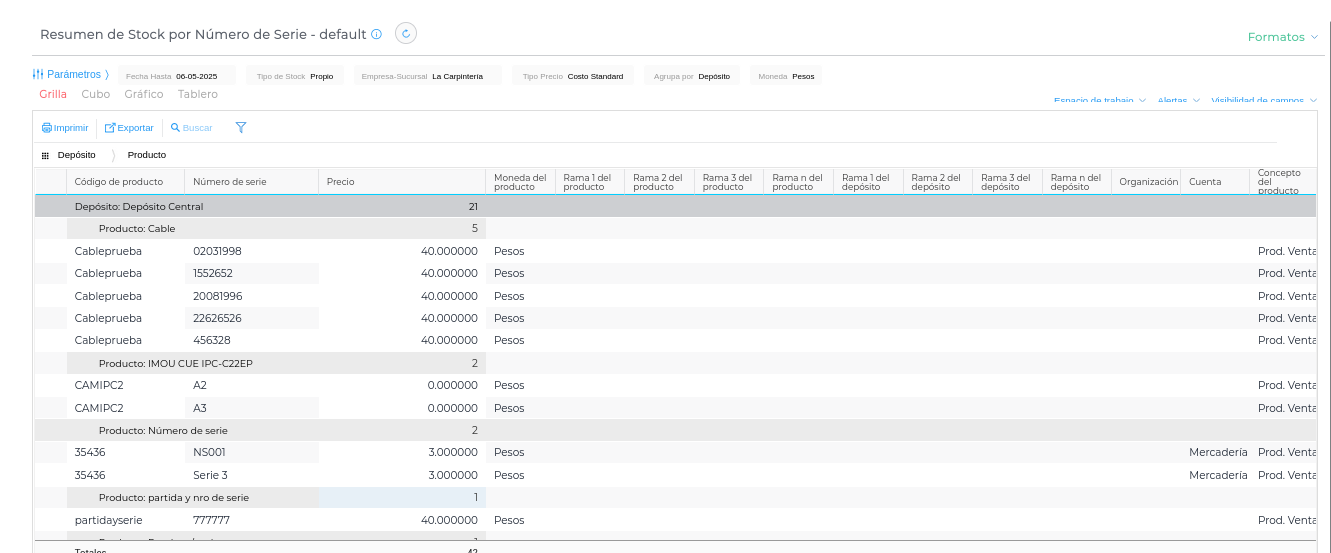 Muestra el nombre del producto, su número de serie, el depósito al cual corresponde y su cantidad.