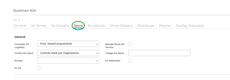 Es stockeable: al activar esta opción, se le indica al sistema que se desea llevar un control de stock de todas las transacciones en donde intervenga el producto creado. El sistema habilita una solapa adicional en la configuración del producto denominada Stock, la cual permite configurar el comportamiento específico del producto creado para dicho circuito.