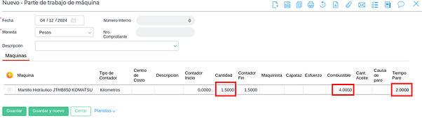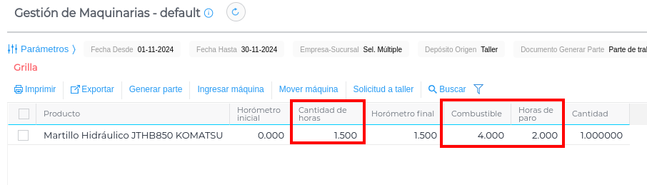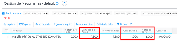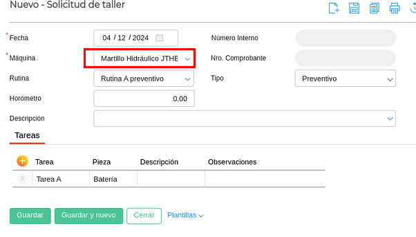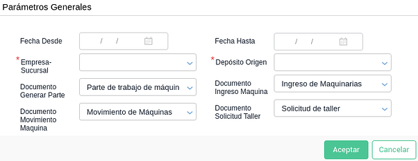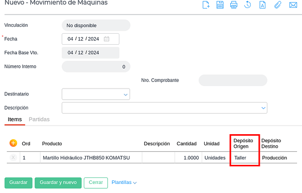Para realizar un Movimiento o Solicitud de Taller, sí se requiere seleccionar la maquinaria. Utilizará el depósito seleccionado en los parámetros a modo de “depósito origen” y el nombre de la máquina y horómetro inicial para ambos documentos: