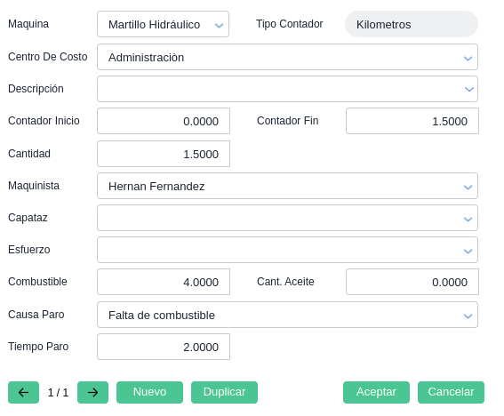 Apenas se completan los parámetros y se clickea en Aceptar, se visualizan las maquinarias para completar tres campos posibles y generar transacciones: