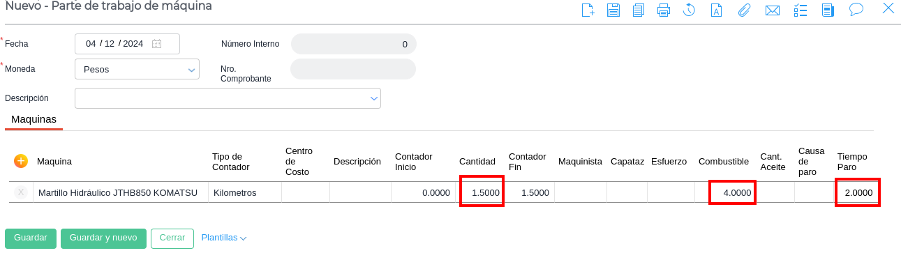 Por ejemplo, la generación de un Parte de Trabajo tomará los tres datos ingresados (no hace falta seleccionar la maquinaria para su creación):