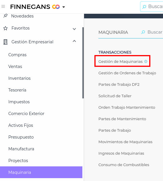 Se accede a través de Menú → Gestión empresarial → Maquinaria → Transacciones → Gestión de Maquinarias