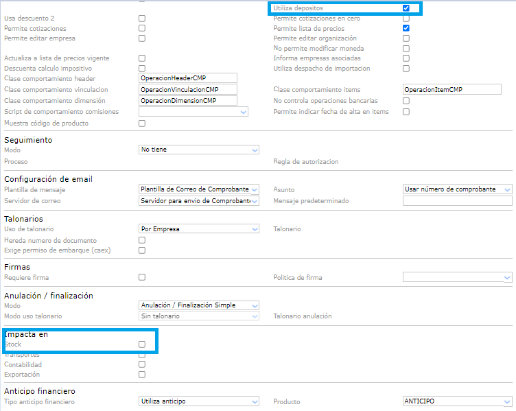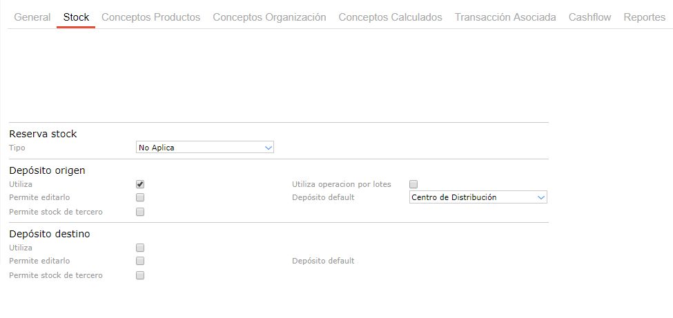 - Para los documentos que se van a generar para la reserva de stock, se debe seleccionar la opción reserva stock. Además, este tipo de documento debe tener el check de “Utiliza organización” en la solapa “General” y el concepto de Clientes configurado.