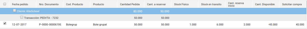 Si el check box no está activo, se valida que la cantidad reservada no sea mayor a stock disponible y la columna Solicitar Compra siempre queda en 0.