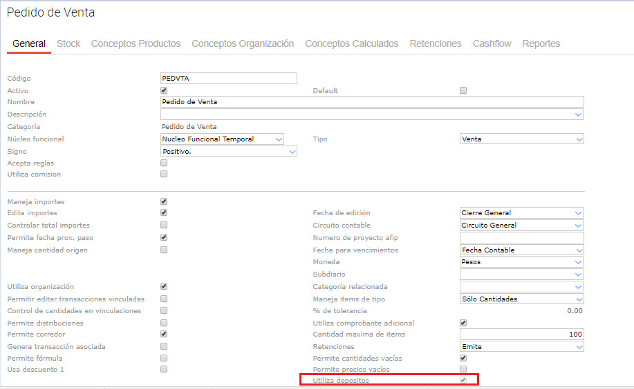 - Los pedidos de venta deben estar configurados como se muestra a continuación check en “utiliza depósitos”.