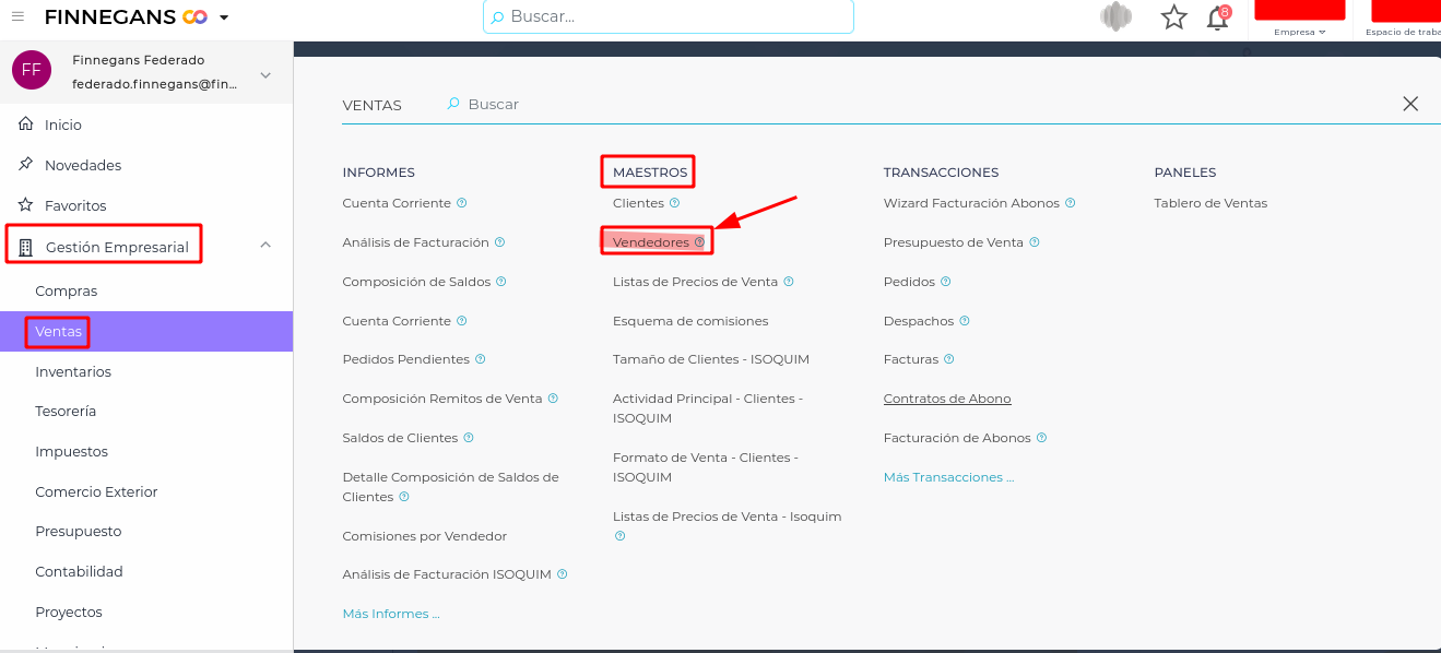 - Realizamos la siguiente ruta: Menú > Gestión Empresarial > Ventas > Maestros > Vendedores.
