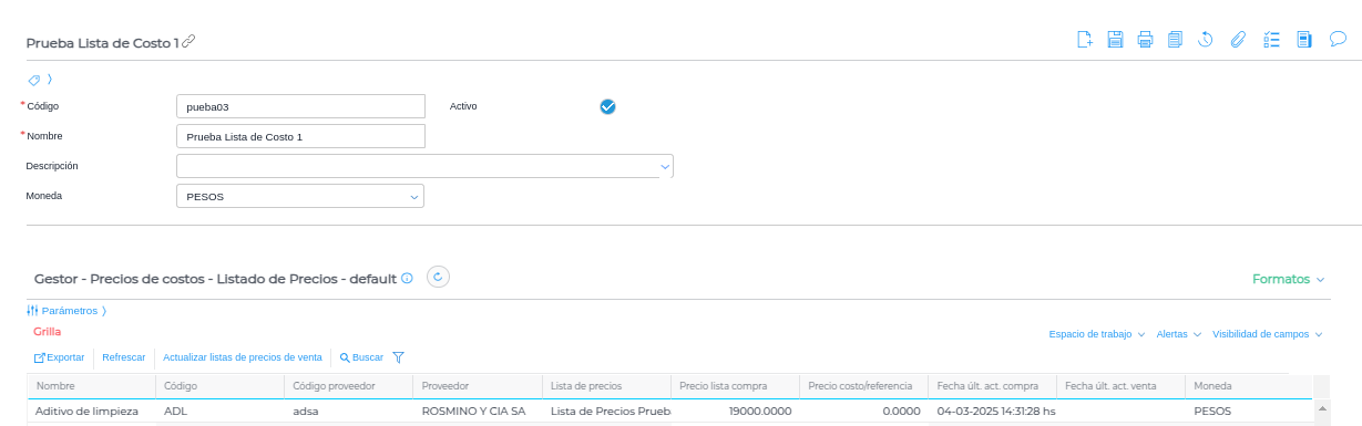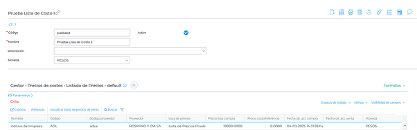 Una vez completados los datos y guardando, se procederá a crear automáticamente la lista de precios de costo: