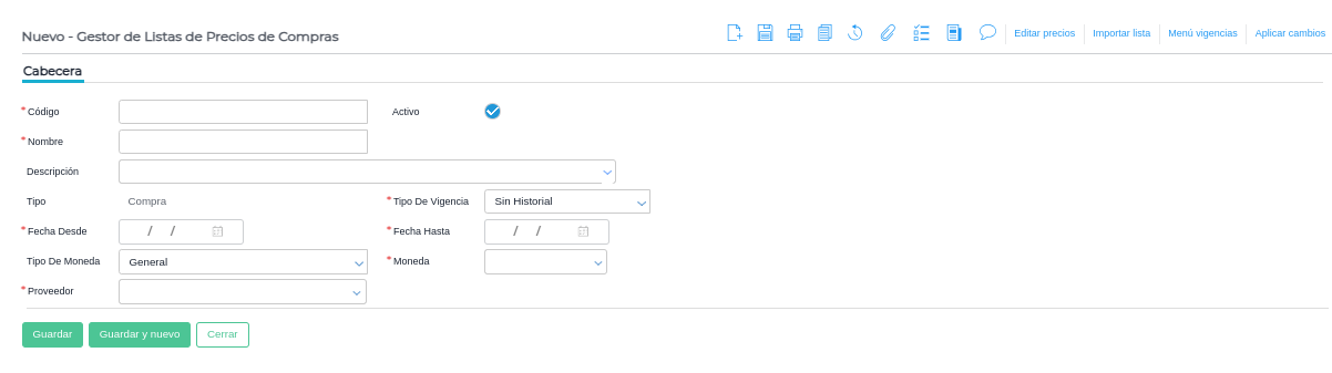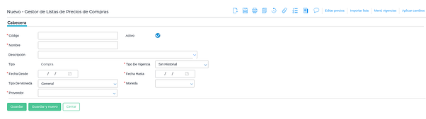 Para crear una nueva lista de precios de compra, se debe clickear en “Nuevo” y se abrirá la cabecera a configurar de nuestra nueva lista: