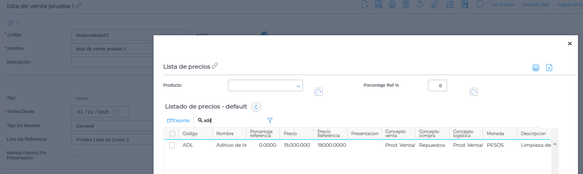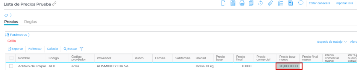 Al ingresar a alguna lista de precios de venta que use ésta lista como referencia, podremos observar que el precio del producto se actualiza correctamente: