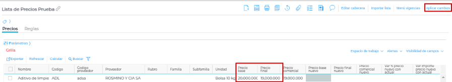 Para guardar este cálculo, hay que confirmarlo presionando el botón “Aplicar cambios”. Una vez apretado, los importes pasarán a las columnas correspondientes al precio real del producto: