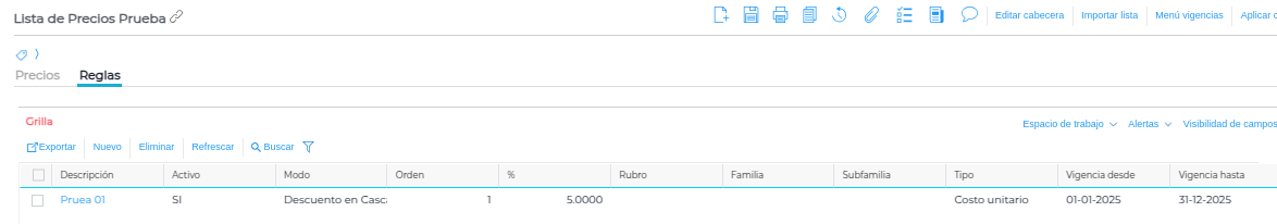 Tenemos esta regla cargada en nuestra lista, la cual cuenta con un descuento del 5%: