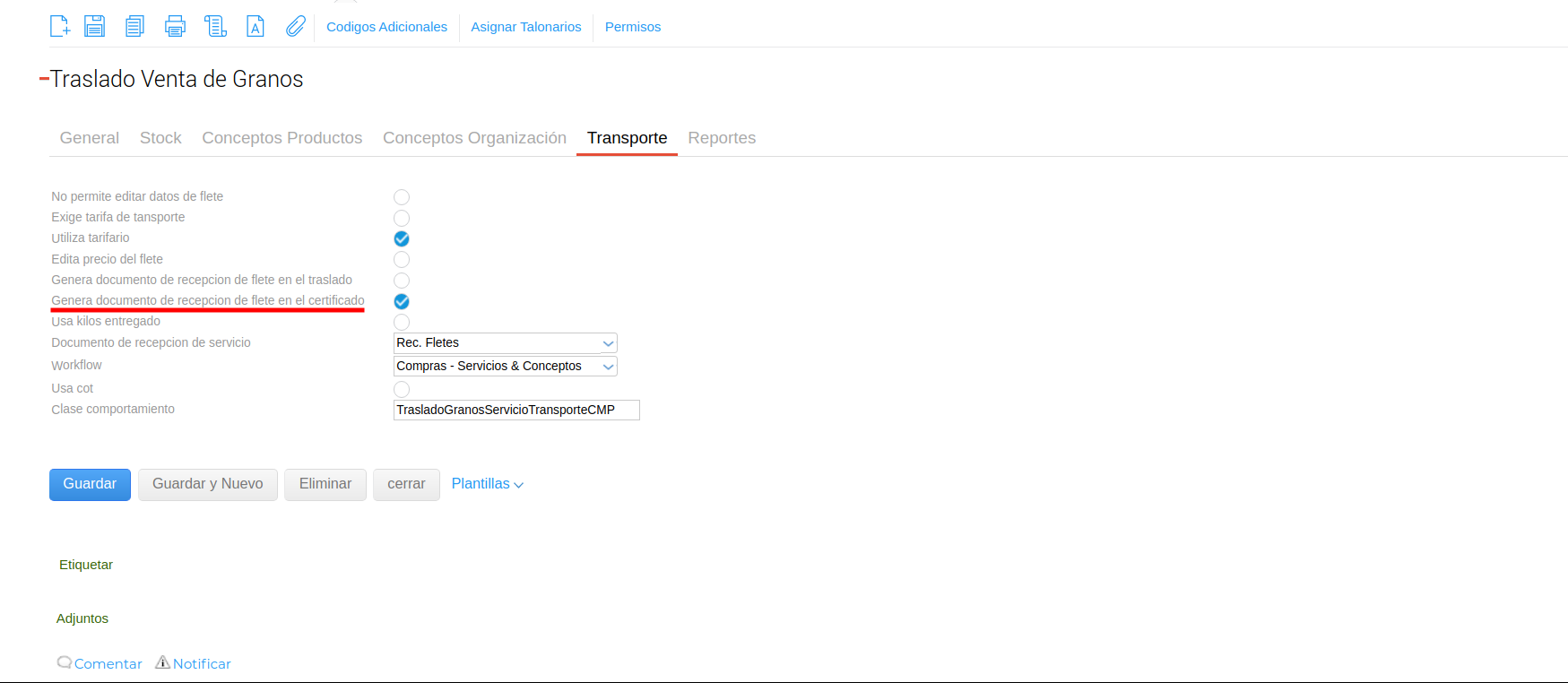 - En primer lugar, verificar que este error sea el indicado ir a Diseño del espacio de trabajo - Documentos - Tipos de Documentos y buscar el documento “Traslado venta de granos”. Revisar si tiene marcado el check de “Genera documento de recepción de flete en el certificado”