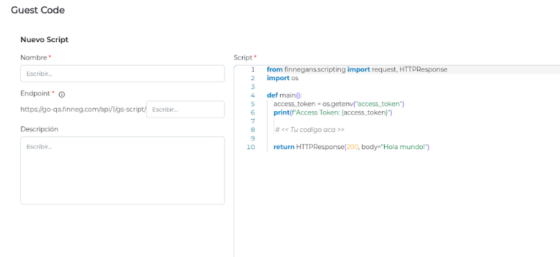 Es una aplicación de GO que permite a los usuarios crear scripts de Python de forma simple, sin necesidad de infraestructura externa. Estos scripts de Python se desarrollan directamente desde la plataforma y se ejecutan de forma temporal cuando son invocados. Cada script genera una URL única (conocida como “endpoint”) que puede ser utilizada por distintas herramientas del sistema Finnegans GO.