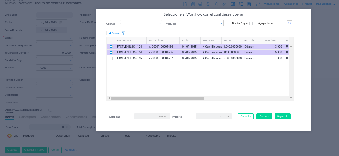 - Se realiza una nota de crédito de venta, llamando por asistente a la factura de venta del punto 1. Se puede seleccionar uno o varios ítems de la misma factura: