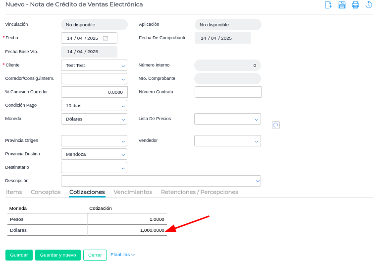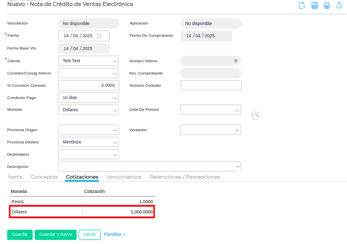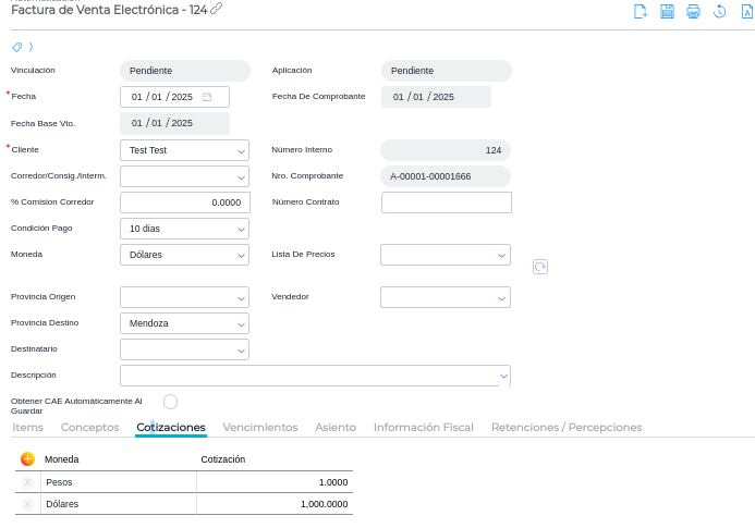 - Una factura de venta está registra el 01/01/2025, en moneda dólares, con una cotización de $1.000:
