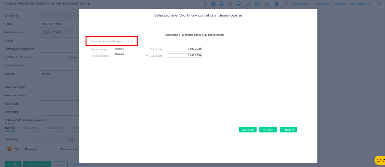- En el paso siguiente, aparece visible el check Hereda cotización de origen, si se lo tilda se oculta la funcionalidad de cambiar la moneda del documento de origen en el documento de destino: