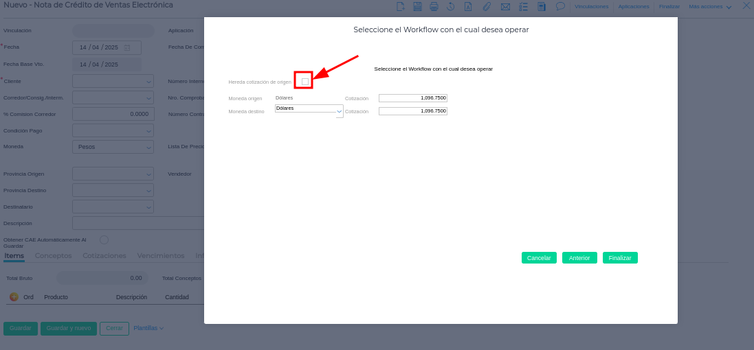 - Hereda: el documento destino tomará obligatoriamente el tipo de cambio del documento origen. El check “Hereda cotización origen” del asistente se mostrará tildado y no será editable (grisado).