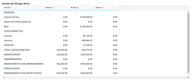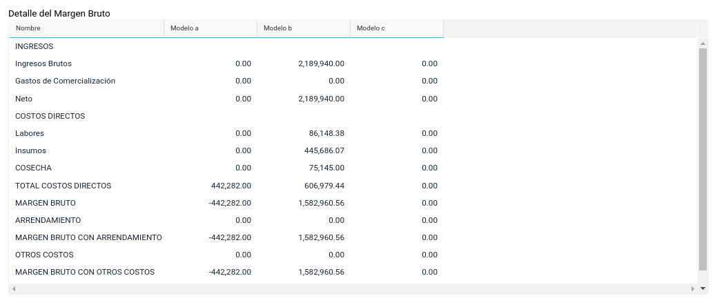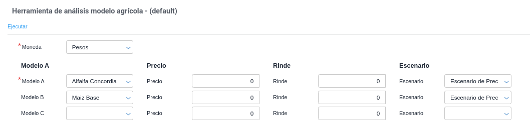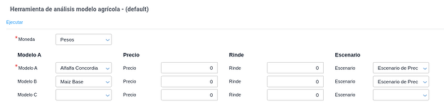 Esta funcionalidad permite la comparación entre modelos agrícolas, analizando diferentes modelos agrícolas basadas en el precio el rinde estimado, el precio del kilo del grano y el escenario de compra especificado para cada modelo, con el objetivo de ayudar en la toma de decisiones sobre qué modelo es más conveniente planificar y ejecutar. Permite analizar márgenes de sensibilidad de distintos escenarios para un período de tiempo determinado.