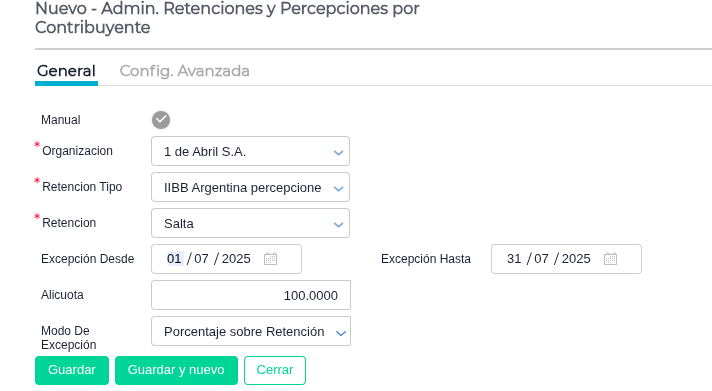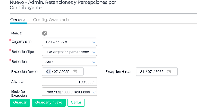 Sin Riesgo (SR): Si el contribuyente es “sin riesgo”, el sistema aplica el 100% sobre el porcentaje de retención configurado. Esto significa que la alícuota de retención se mantiene sin cambios (ej., si la retención es del 3.6%, se aplica el 3.6%). La fecha que se registra es la del mes en que se está ejecutando el padrón.