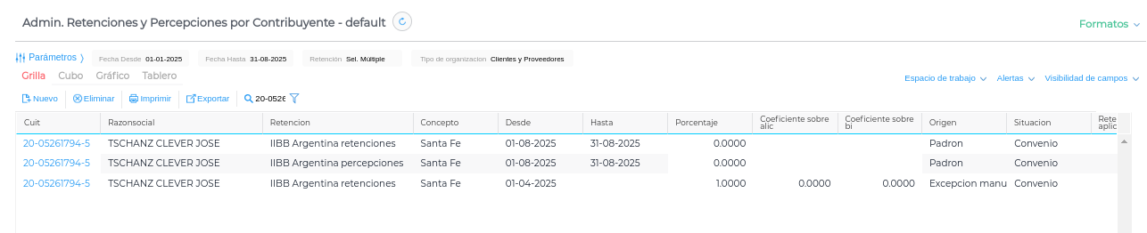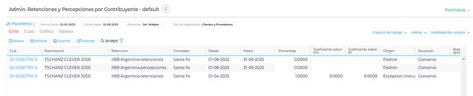 Creación de Líneas: Por cada CUIT encontrado en el padrón, se creará una nueva línea en la vista “Administración de retenciones/percepciones por contribuyente”.