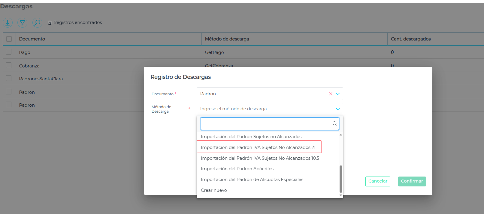 - Método de descarga: seleccionar la opción “Importación del Padrón IVA Sujetos no Alcanzados 21” . Presionar “Confirmar”.