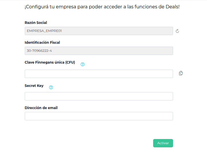 Se debe activar la funcionalidad de Deals en el espacio de trabajo en el que se está trabajando. Para hacerlo en cada empresa, es decir, en cada compañía que tenga diferente CUIT se deben realizar ciertas configuraciones. Para esto, nos dirigimos a Menú → Deals → Configurar Empresa.