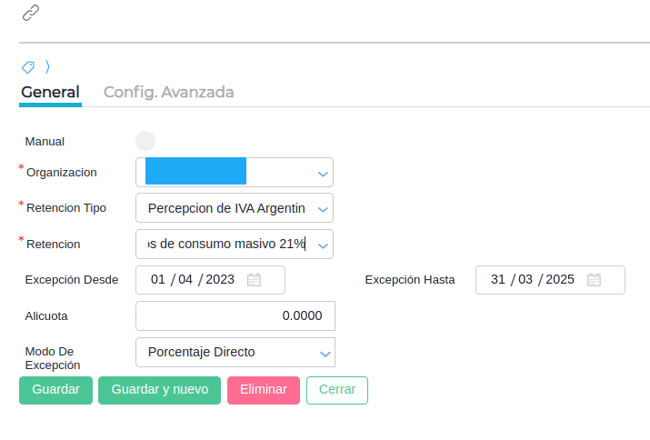 - Si se realiza una configuración errónea (por ejemplo se pone incorrectamente el código de percepción) y se graba, para corregirlo se debe eliminar el registro y volverlo a crear desde cero.