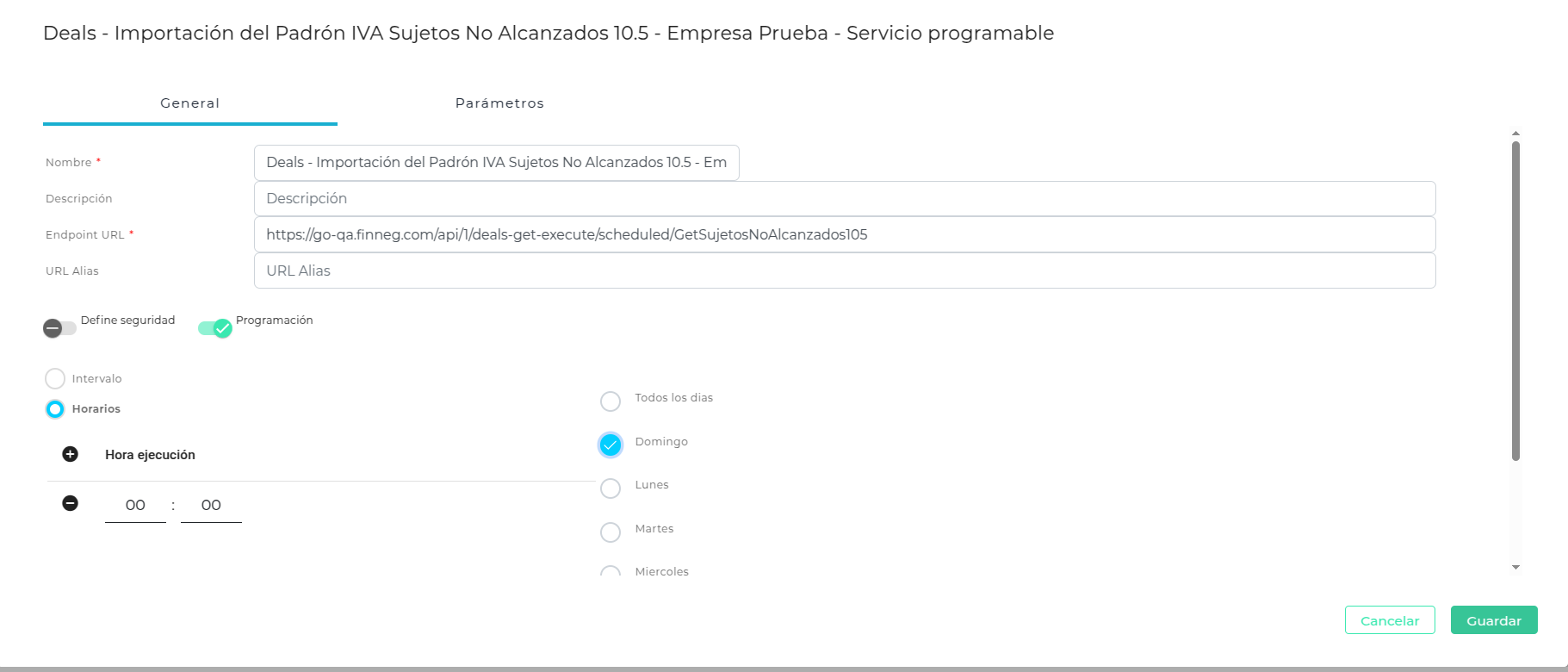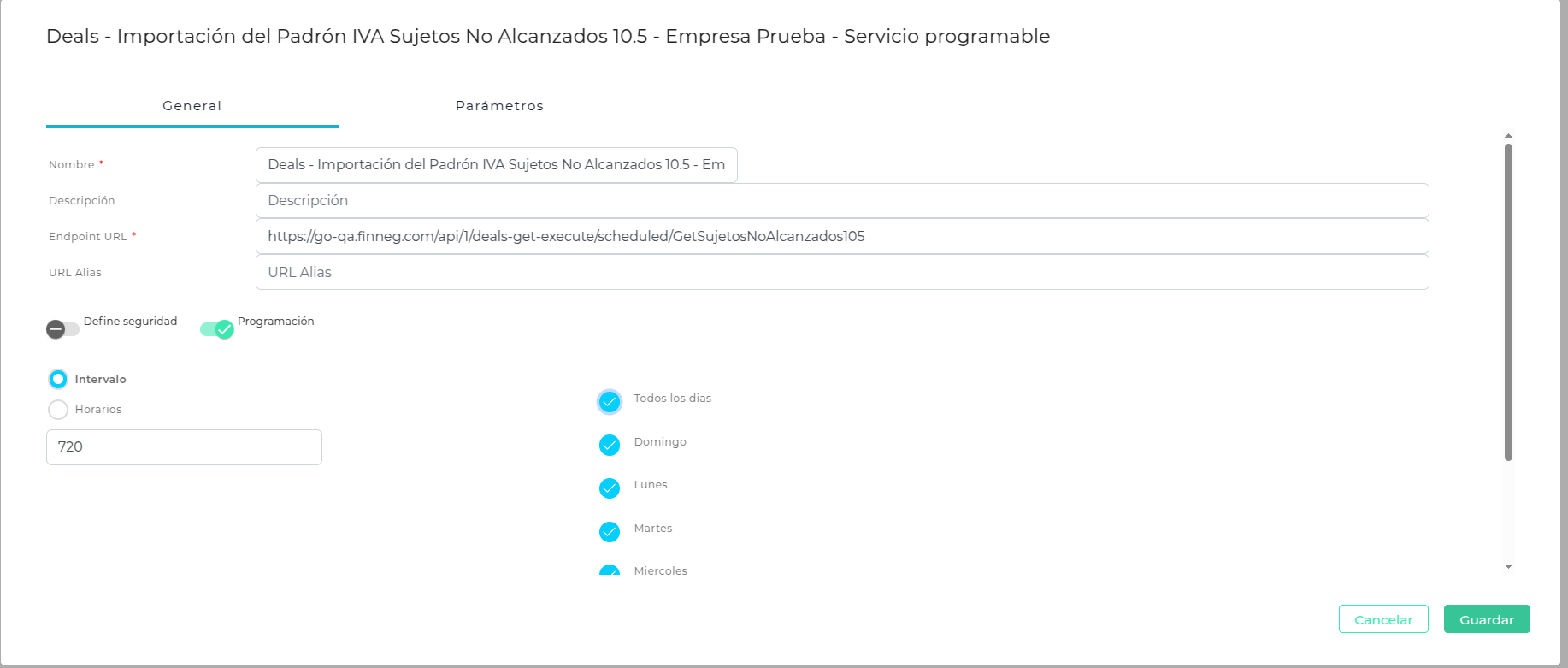 Existen 2 formas de configurar la ejecución, una generada por un intervalo de tiempo, donde se fija una cierta cantidad de minutos y transcurrido el mismo se ejecutará la corrida del padrón. Por ejemplo se puede fijar una ejecución cada 12, es decir 120 minutos, como se observa en el ejemplo a continuación