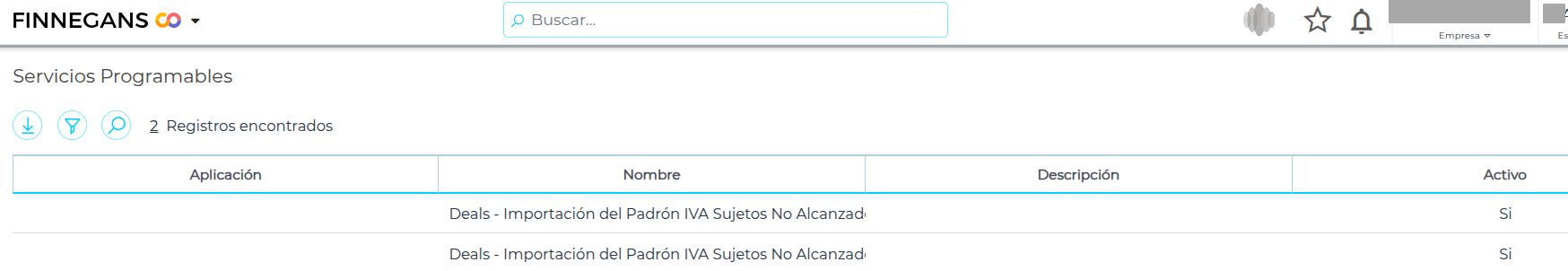 Una vez configurada las empresa, el paso siguiente es activar dos descargas automáticas, una para cada concepto de percepción de IVA para sujetos no alcanzados.
