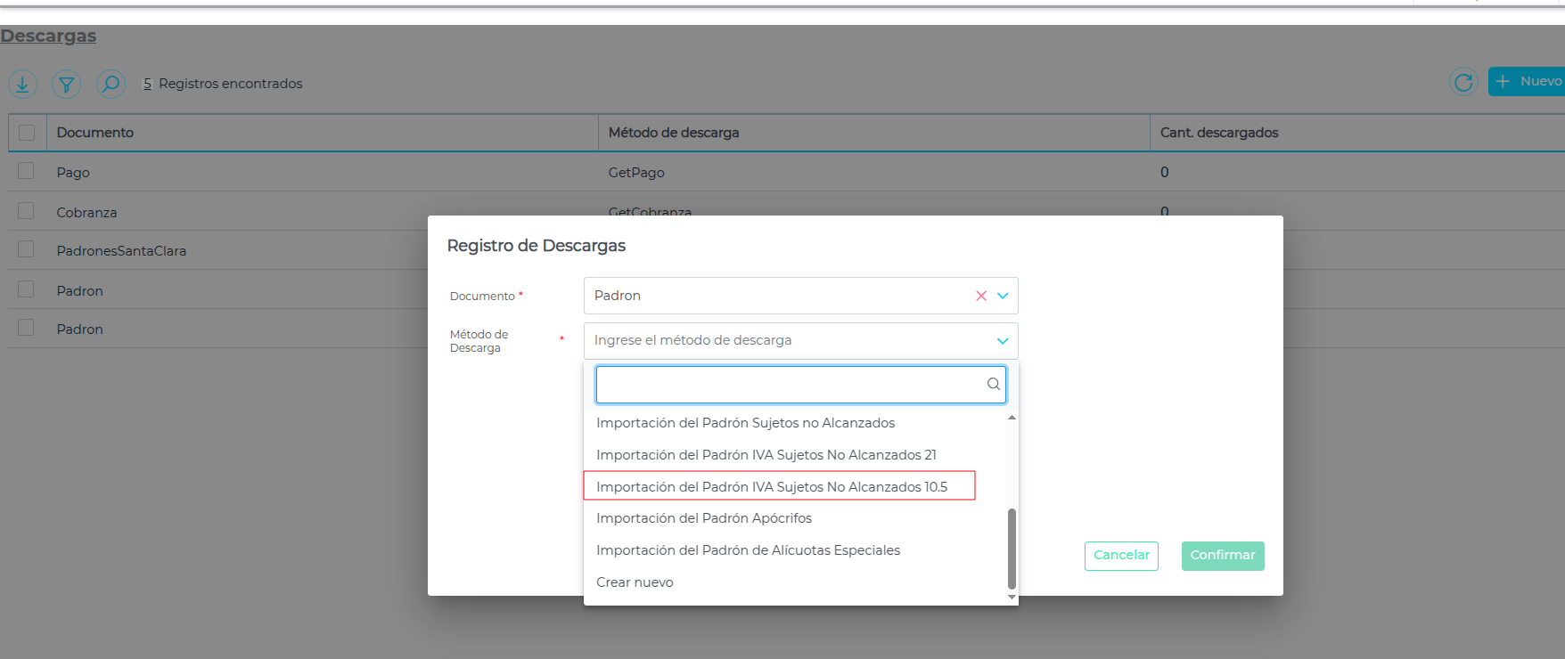 - Método de descarga: seleccionar la opción “Importación del Padrón IVA Sujetos no Alcanzados 10.5”. Presionar “Confirmar”.