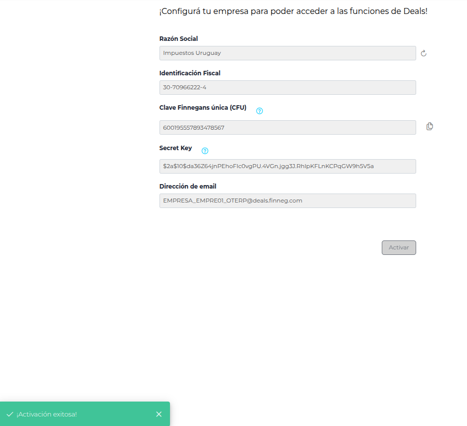 Como se puede observar, solo vienen detallados los campos “Razón social” e “Identificación fiscal”. El siguiente paso es presionar el botón “Activar” y automáticamente se completarán el resto de los campos.