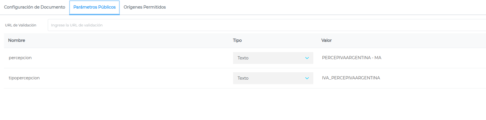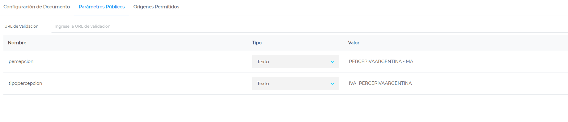 Dentro de la solapa “Parámetros Públicos”, en la columna “Valor”, se verán reflejados los códigos correspondientes al “Tipos de retención” que en este caso es la Percepción de IVA y el código del “Concepto”, que en este caso corresponde al de la alícuota del 10.5. Esto viene configurado por default, pero podrá ser modificada manualmente en caso de ser necesario o en caso de que no aparezca se puede configurar manualmente: