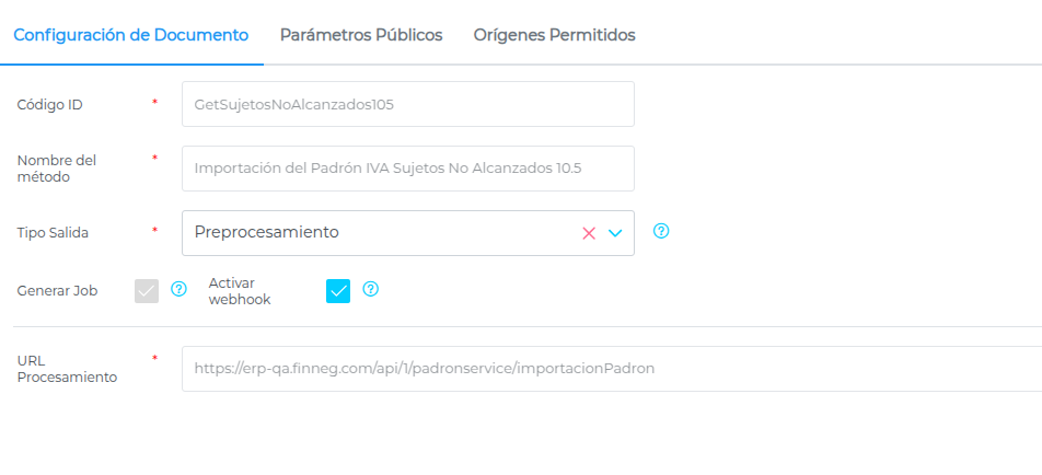 Ingresar en primer lugar, a la descarga que se configuró para el concepto de IVA al 10.5, dirigirse a la solapa “Configuración de Documento”, el sistema trae por default los campos completos. Los checks“Generar Job” y “Activar webhook” deben dejarse activos.