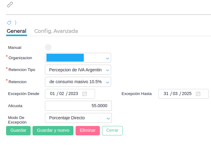 Primero crear la que corresponde al concepto de percepción de IVA (para productos de consumo masivo) para la alícuota de 10.5, para ello completar los siguientes campos: