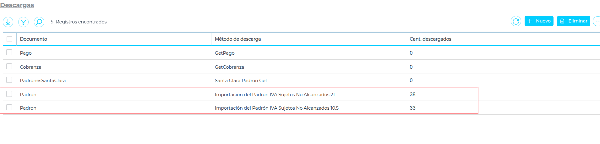 Una vez dentro de la vista, y luego de haber realizado las configuraciones anteriores, se puede ver que automáticamente se generará una línea para cada descarga configurada.
