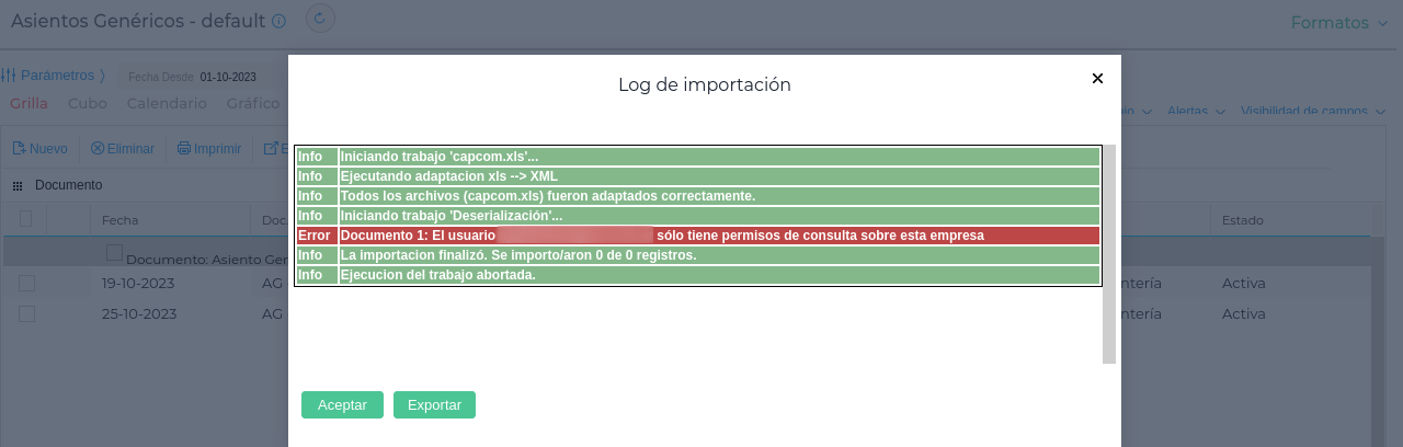Al querer importar asientos genéricos, aparece el mensaje: “El usuario xxx sólo tiene permisos de consulta sobre esta empresa”