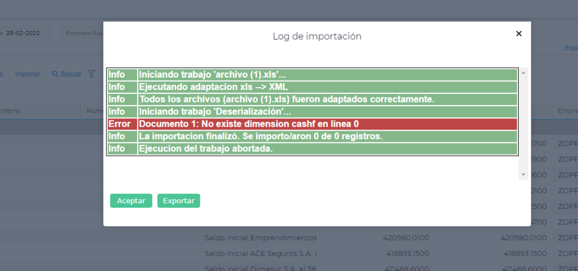 Al querer importar un asiento genérico, el sistema muestra el siguiente mensaje: Documento 1: No existe dimensión cashf en la linea 0.