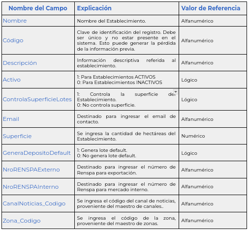 Los Establecimientos representan una configuración esencial para una adecuada y correcta gestión agropecuaria. En ellos se especifican las actividades que formarán parte de las planificaciones agrícolas y ganaderas. Es importante tener definida la cantidad de hectáreas que forman tanto el establecimiento como así los lotes del mismo.