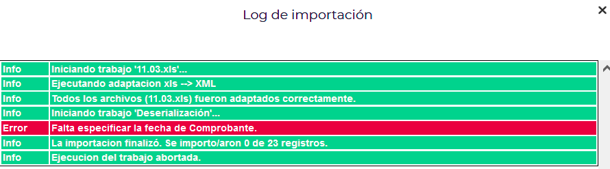 Al intentar subir el excel, sale este mensaje en el Log de Importación: