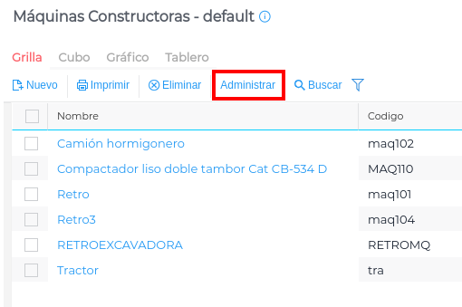 Se accede al maestro de Maquinarias desde Menú →.Gestión empresarial → Maquinarias → Maestros → Máquinas constructoras