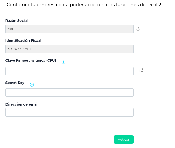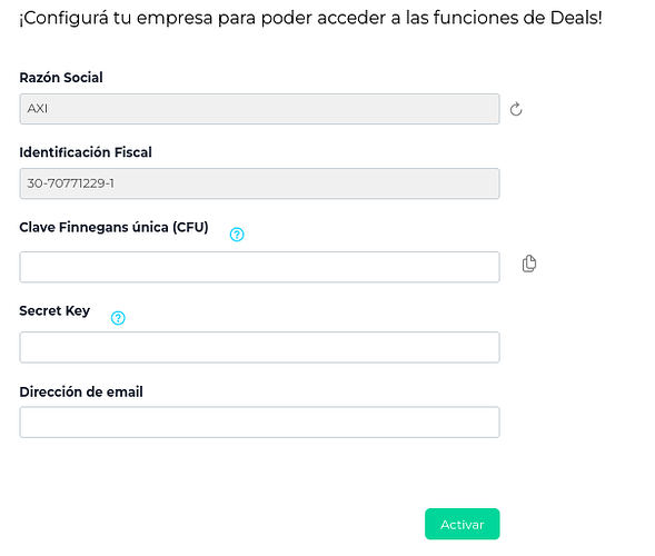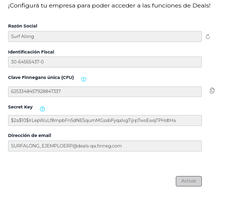 Como vemos, solo viene completo con la “Razón social” y la “Identificación fiscal”. No hace falta que completes nada, ya que el resto de los campos se completarán al hacer click en “Activar”.