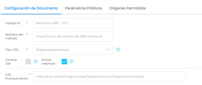 Al ingresar al mismo, y dirigirnos a la solapa “Configuración de Documento” vemos que el sistema trae por default los campos completos. Los checks“Generar Job” y “Activar webhook” deben dejarse activos.