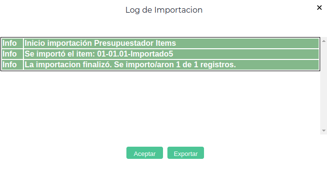 Realizada la importación, el sistema indicará el resultado de la misma.