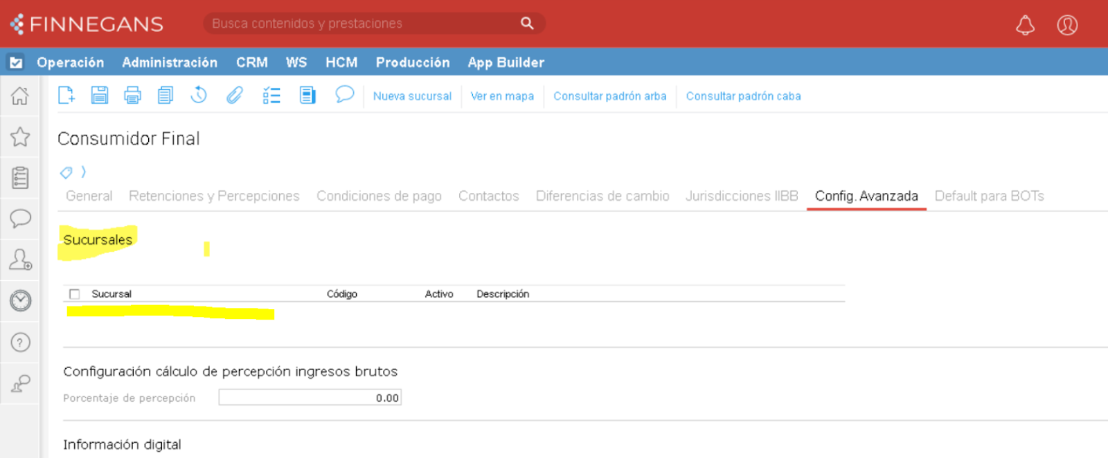 - Verificar en la solapa de configuración avanzada el campo de sucursales. El campo “sucursal” de la plantilla de Excel hace referencia a este campo dentro del maestro de clientes,