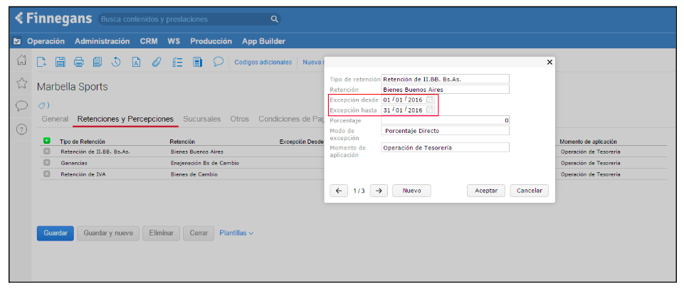 Se agrega una excepción en la solapa retenciones de cada cliente/proveedor vigente desde el primer día del mes hasta el último y coloca el porcentaje indicado en el padrón.