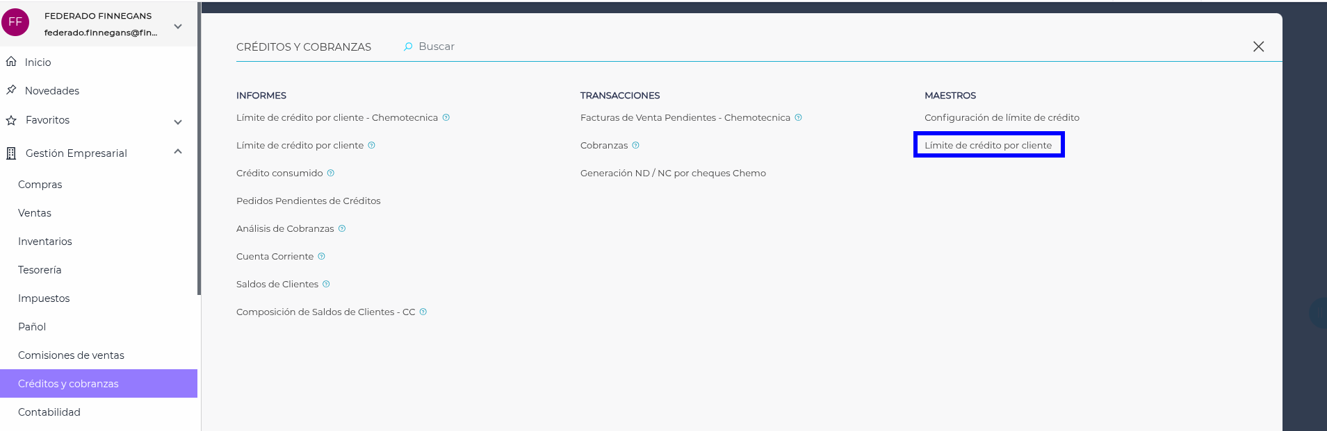1 - Debemos dirigirnos a Menú → Gestión Empresarial → Créditos y cobranzas → Maestros: Límite de crédito por cliente.