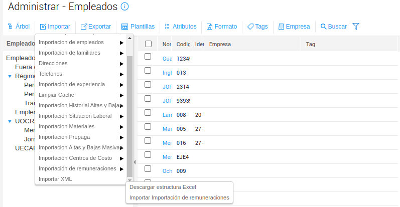 a. Ingresar a Empleados → Administrar → Importar → Importación de Remuneraciones → Descargar estructura excel