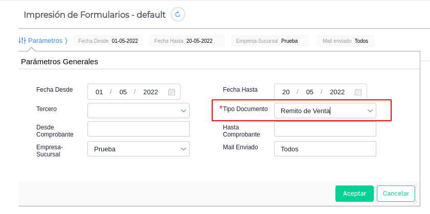 Ruta: Gestión Empresarial > Ventas > Más Transacciones > Impresión de Formularios